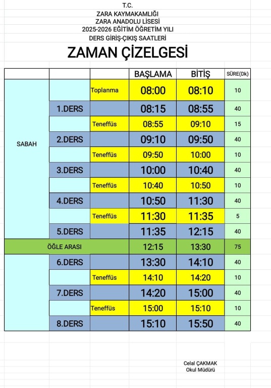 2025-2026 EĞİTİM ÖĞRETİM YILI DERS GİRİŞ-ÇIKIŞ SAATLERİMİZ